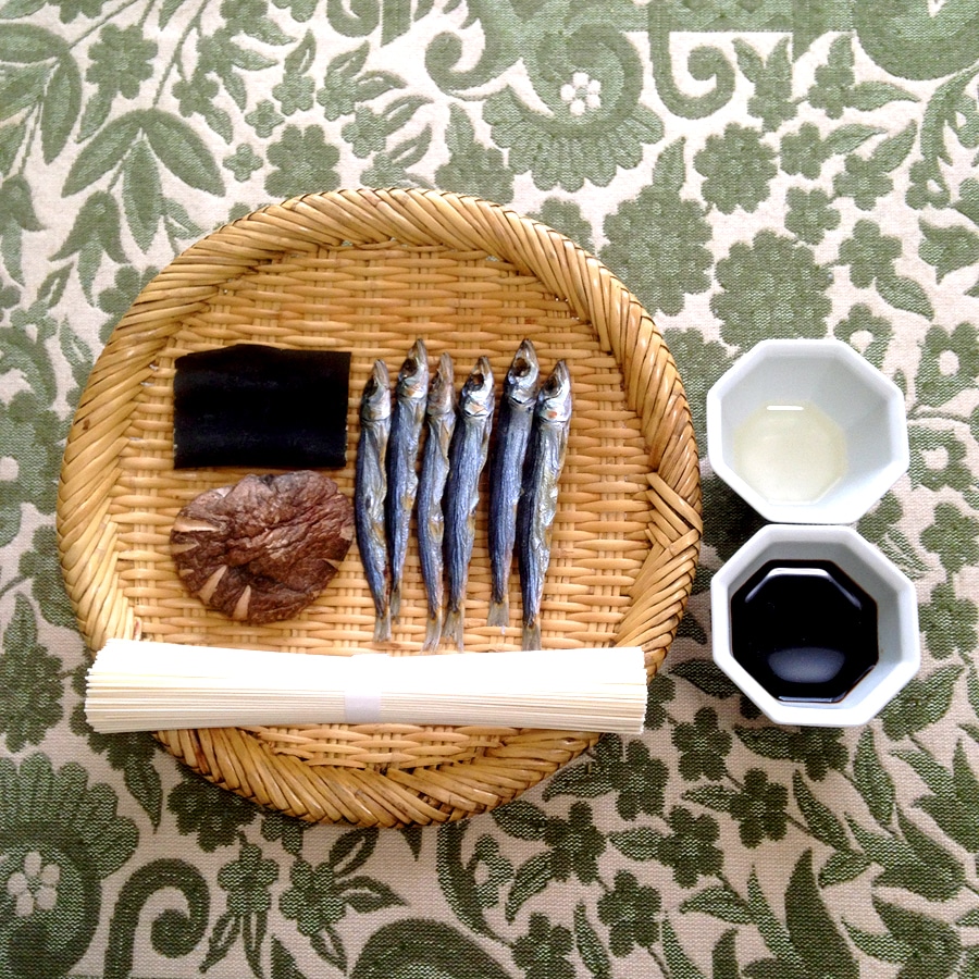 ①鍋に水(600ml)を入れ、潤目いわし がらんつ(6尾)、干し椎茸(1枚)、昆布(5cm角)を30分以上浸けます